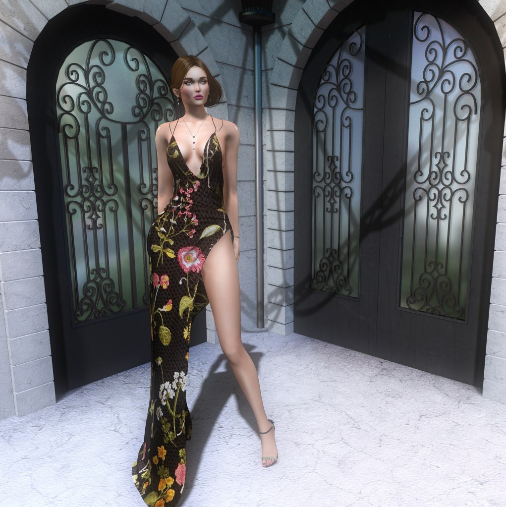 Do you love visiting monthly fashion events in Second Life? Designer Showcase is a stop you don’t want to miss. Deborah, by Legendaire, features a dangerous neckline and slit with a variety of colors and prints, and it’s available at Designer Showcase’s September round!